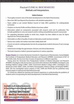 Thoroughly revised in view of the latest developments in the field of biochemistry. More than 400 Case Reports and Viva Questions with detailed explanations. Topics added as per revised Medical Council of India (MCI) guidelines for undergraduate curriculum. Chapters on Anemia Profile and Bone Markers have been added. Information added on components associated with research work and its publication. This includes guidelines to carry out research and for writing and publishing research manuscripts. For upgrading laboratory quality to world class, chapter has been added on Lean Six Sigma Approach for Clinical Laboratories. Information on effect of quality of water on laboratory results has been included. Various new cardiac risk markers have been widely dealt with. A book not only for undergraduates but also for postgraduate students because of vast coverage of topics. Useful book to bridge the gap between clinicians and clinical laboratories. The book is based on Author's personal experience in various capacities.